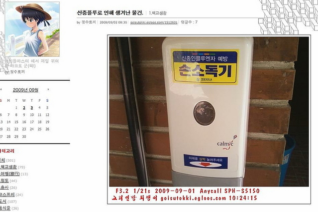 블로거 퀘스트키는 최근 대학에 설치됐다는 소독기를 소개했다.기계에는 신종 플루 예방 손소독기라는 글자가 보인다.손 씻기는 병을 막는 기본.독감의 유행을 계기로 손 씻기에 대한 의식이 단번에 바뀔지도 모릅니다.